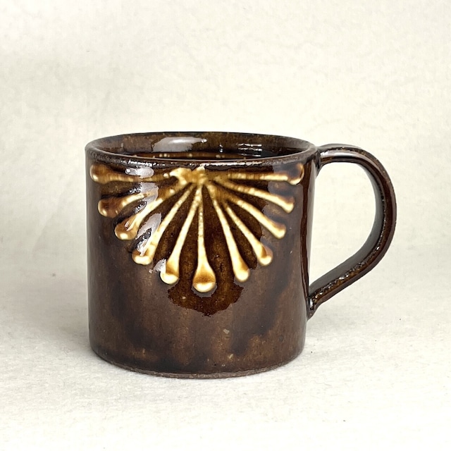 民藝調な雰囲気を纏ったたっぷり容量のマグ。 艶やかな美しい飴色の釉薬の上にはぷっくりしたイッチン技法(表裏の二ヶ所)が施され、表情豊かなデザインになっております。 つるっとした釉薬なので口当たりも良く、また茶しぶや匂い移りが少ないのも特徴です。 持ち手もしっかりと大きめなので、特に手の大きな方には安定したグリップ感が得られるマグです。 [素材]陶器 [サイズ]Φ80mm H78mm [容量]約270ml 電子レンジ:○ 食洗器:○ オーブン:× 直火:× ※商品の特性上、色や形状のムラがある場合がございます。ご了承の上、ご購入いただきますようお願いいたします。 岐阜県 / 美濃焼 正陶苑