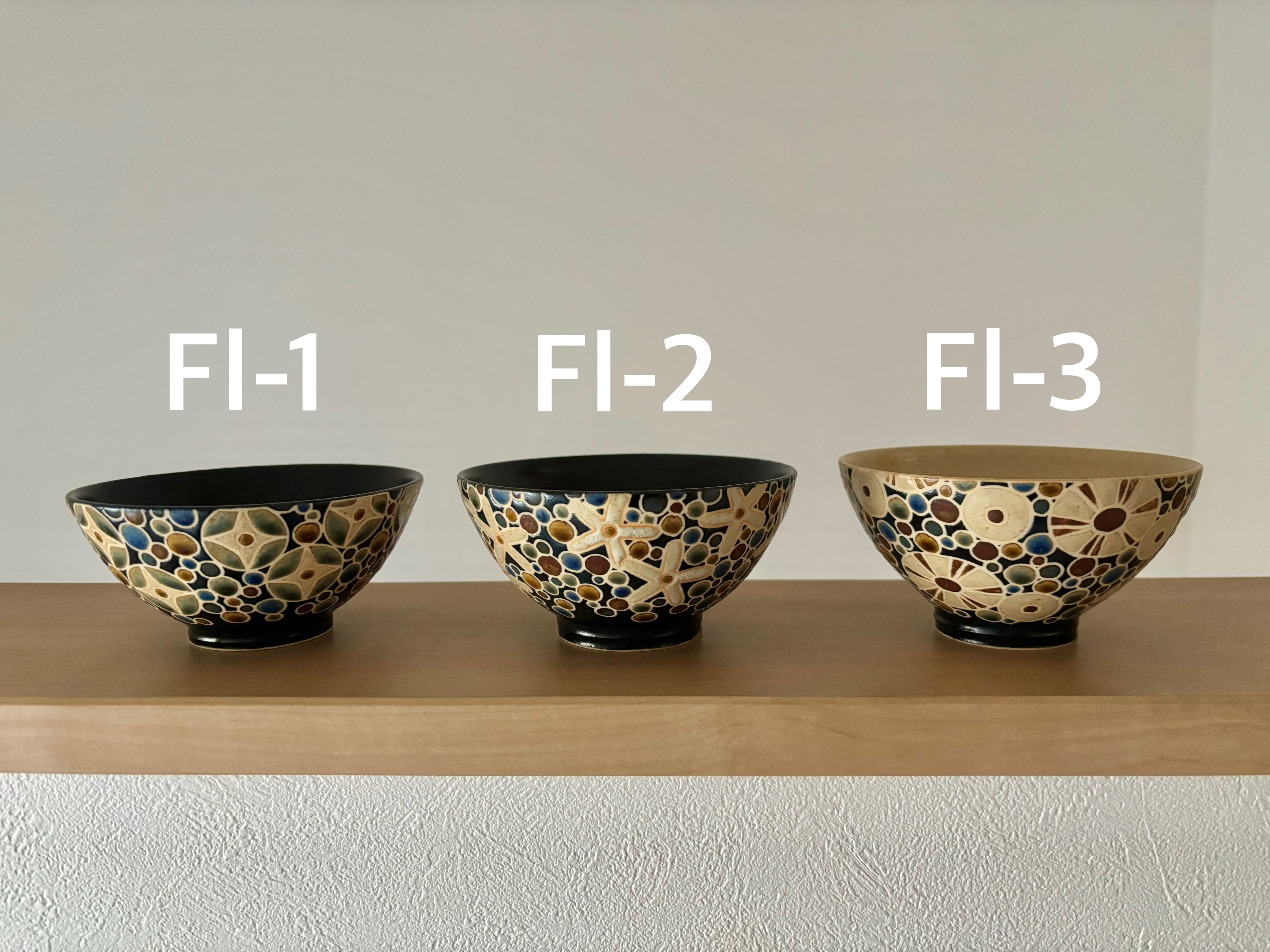 胴から腰に掛け目一杯に施された図柄が、なんとも贅沢な飯碗たち。